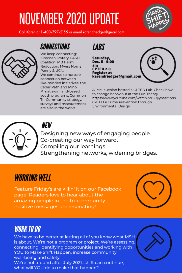 - Make Shift Happen: A Community Crime Prevention and Community Well-Being Initiative in The Pas, Manitoba, Opaskwayak Cree Nation and the RM of Kelsey. Monthly updates available. The latest November update, October update, September update. We've done some research into Promising Crime Prevention Strategies, have a look. See the latest Powerpoint on Crime Prevention Strategies featuring The Pas and area. Our creative team has been writing stories to increase awareness. Make Shift Happen, Why? is an article that explains more. The first published article 'We Create Cool' I wrote to get things started. The rest Denise Duncan has written and have been published in Opasquia Times and or on our Facebook page 'Make Shift Happen @tricommunityawareness : SCAN, Sam Waller Museum, Denise's Spark, Anger Solutions, What a Wonderful World, We area a Team, The Pas Immigrant Services, Storytellers Film Festival, Stay Safe Badge Campaign, Round the Bend Farm, OCN Gardens, Parades, Oscar's Place, Mino Pimatisiwin, Mindfulness in Education, Mental Health Stigma, Men's Support Group, Living Waters Soup Kitchen and Northern Gateway Chaplaincy, Jr. Chief and Council, Grief Edu-Therapy, Disc Golf: A Walk in the Park, Citizens on Patrol: Eyes and ears of community, The Pas Bear Clan, Fall Prevention Program, The Pas Handi-van: an essential service, Pauline Ballantyne, Nisiiminan Safe Rides, The Pas Friendship Centre Food Security, Unleash Solutions, Precious Pets, Rhonda Head, Childhood Reflections, Music - Soothing the Human Soul, I Came for the Job, Silver Linings (written by Tara Manych), WUC, Looking Out Our Backdoor, Mind Shift - FASD Coalition (written by Joanne Wyman), Trapper Spirit, Truth, Charity and Loving Kindness, Rotarians, Creating Community, Dr Banks, Superheroes, Danielle Geddes, Skatepark, Small Town Mayor, Danny Halpin, Canadian Mental Health, Perchaluk Apiaries, Golden Agers,